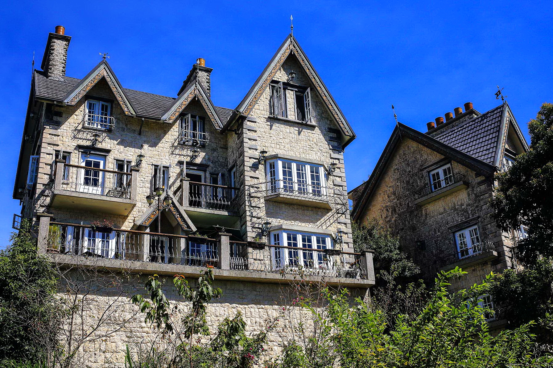 淡古色的石材、斜頂式的屋簷、有如城堡般的外型,包藏在琳瑯滿目的各種花草樹木林中。