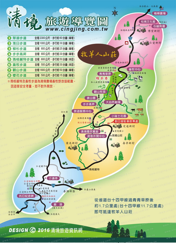 國道一號高速公路 → 彰化系統交流道(196k) → 國道三號高速公路 南下 → 霧峰系統(中橫系統)交流道(214K) → 轉接國道六號(0K) → 循國道六號下"埔里端"交流道 (37K) → 接台14線經埔霧公路往霧社方向前進 → 霧社 → 再循台14甲線往合歡山方向前進 → 「青青草原」→ 過「青青草原」上行1.5公里 → 牧羊人山莊招牌(位於台14甲線11.7k處旁)。